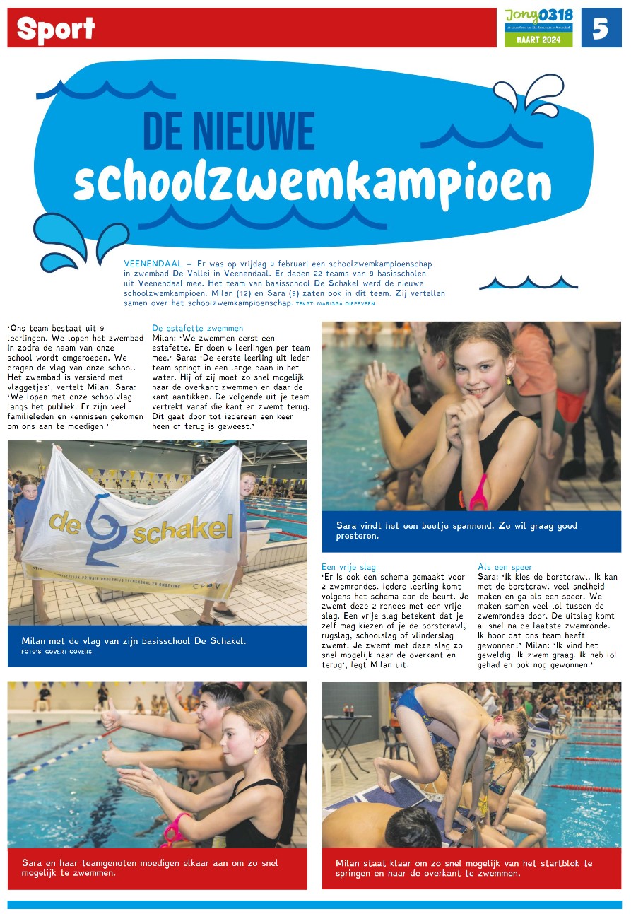 Er was op vrijdag 9 februari een schoolzwemkampioenschap in zwembad De Vallei in Veenendaal. Er deden 22 teams van 9 basisscholen uit Veenendaal mee. Het team van basisschool De Schakel werd de nieuwe schoolzwemkampioen. Milan (12) en Sara (9) zaten ook in dit team. Zij vertelden samen aan Jong0318 hoe het schoolzwemtoernooi was.